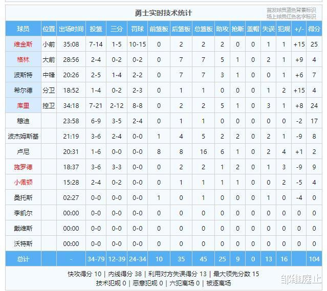 勇士104-99守住主场,避免两连败,缩小和前面球队的战绩差距。维金斯25分,穆迪17分,是最大的两大赢球功臣。库里24分5助,三分球12中2,中规中矩吧。格林关键时刻发挥很好,攻防一体,是隐形功臣。