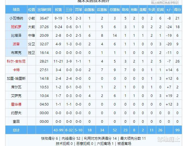 数据:维金斯12分2助、穆迪8分、库里8分3助、波杰姆斯基6分2板3断、施罗德3分2板2断、格林2分4板2助、小佩顿2分、希尔德2分、卢尼5板;科尔-安东尼13分3板3助、波普9分5板、班凯罗8分3板、小瓦格纳5分2断、比塔泽4分12板、艾萨克2分4板、席尔瓦2分。